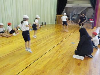 体育館では熱中症予防のため、大型扇風機を回しながら行いました。