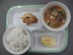 今日の給食。ご飯、揚げ餃子、サンラータン、リンゴでした。今日のご飯は青梅産のお米でした。