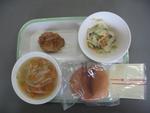 今日の給食。丸パンにチーズと照り焼きチキンを挟んで、チーズ照り焼きチキンバーガーです。チキンがジューシーでとてもおいしかったです。