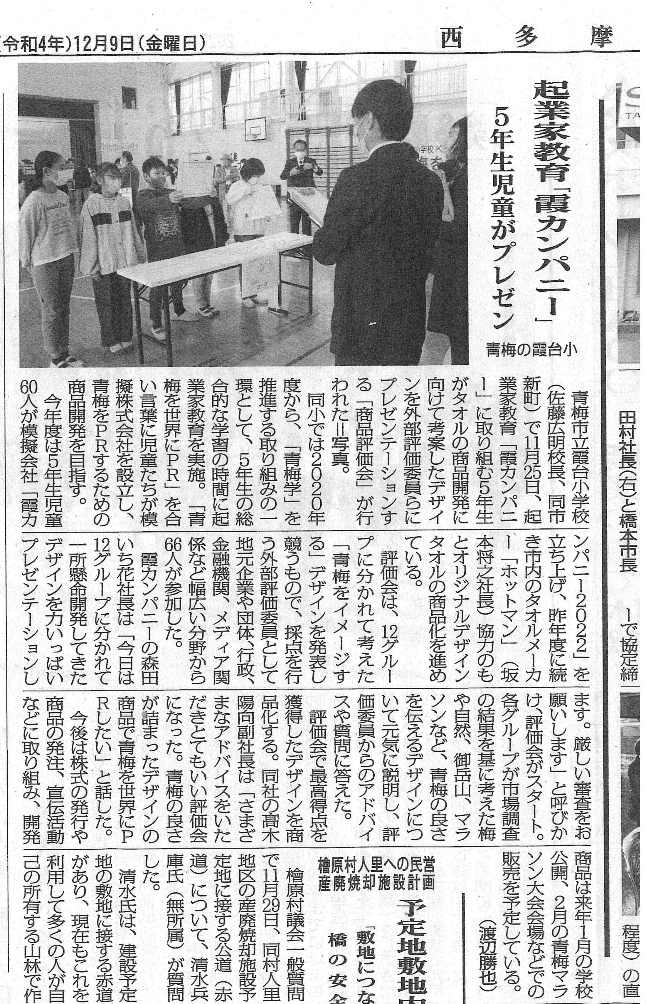 2022.12.5 YAHOOニュース及び西多摩経済新聞、gooニュース、dmenuニュースに「青梅の小学校で模擬株式会社「霞カンパニー」タオルを商品化、販売へ」 の記事が掲載されました。