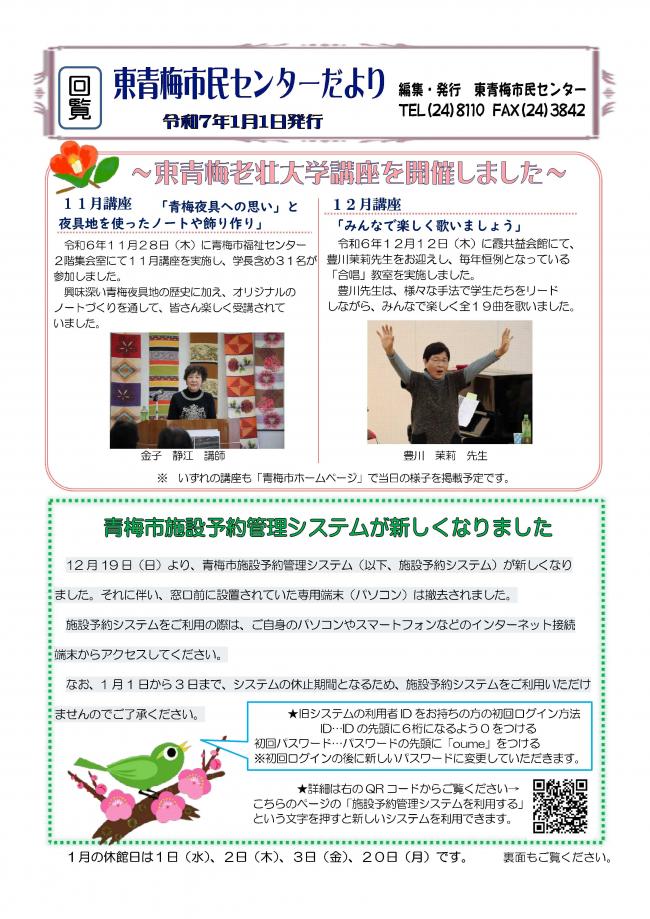 現在地 トップページ > 東青梅市民センター > 東青梅市民センターだより令和7年1月号