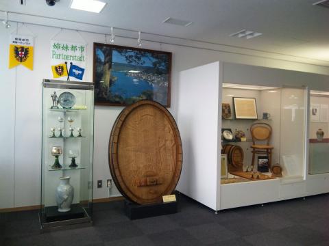 市役所2階の姉妹都市コーナーでは、ボッパルト市から頂いた記念品の数々を展示しています。上記の盟約書の展示も行っています。市役所へお立ち寄りの際には、ぜひお立ち寄りください。