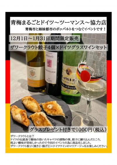 青梅市内の様々なお店や団体が、令和6年12月1日から令和7年1月31日までの間で、青梅まるごとドイツ〜ツーマンス〜を盛り上げようと協力してくれています!