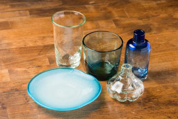 写真手前から時計回りに、泡皿(4寸)スカイブルー2400円、ヒッチーグラス(中)、S200(モール入り)浅葱、ボトル型一輪挿し、にんにく一輪挿し各2200円