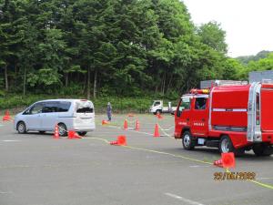 今回の訓練は、火災や災害の発生時に消防団の車両が、現場に安全かつ早くに到着できるよう交差点の進入および一般車両の追い越し等の注意点や、S字やクランク通過といった車両感覚の習得を重点的に訓練しました。