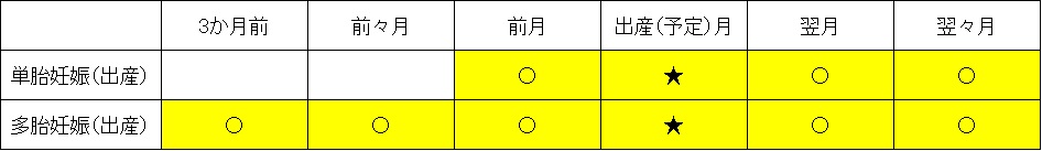 出産予定日(出産日)の前月(多胎妊娠の場合は3か月前)から翌々月までの期間