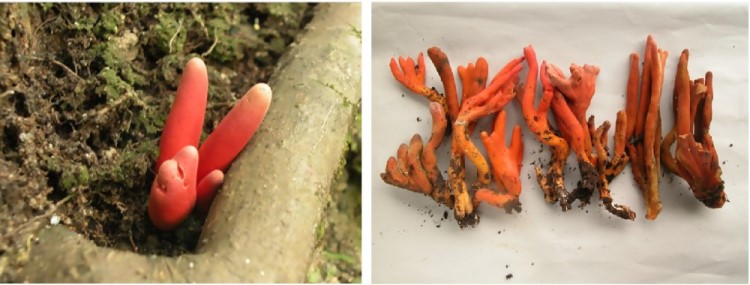| 色と形 | 表面はオレンジ色から赤色、細長い円柱状または棒状で、土から手の指が出ているように群生または単生する。中は白く、硬い。 |